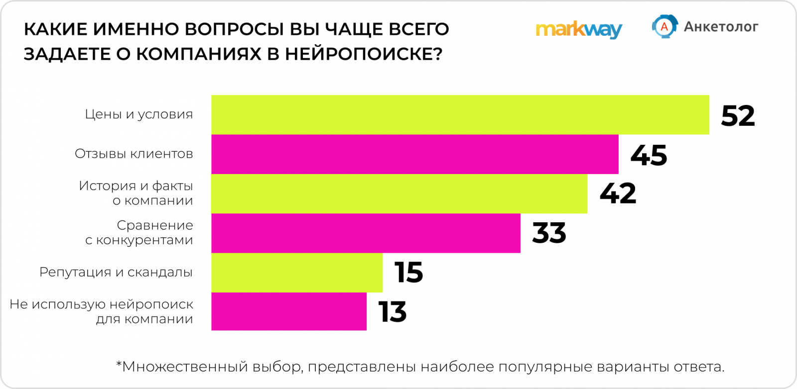 При поиске информации о брендах пользователи в первую очередь интересуются практическими аспектами. Лидерами по востребованности стали цены и условия сотрудничества (52%). Почти столь же значимы отзывы клиентов (45%) и базовые сведения о деятельности компании (42%). Это подчеркивает, что даже при использовании интеллектуального поиска аудитория остается ориентированной на конкретику и проверяемые данные.