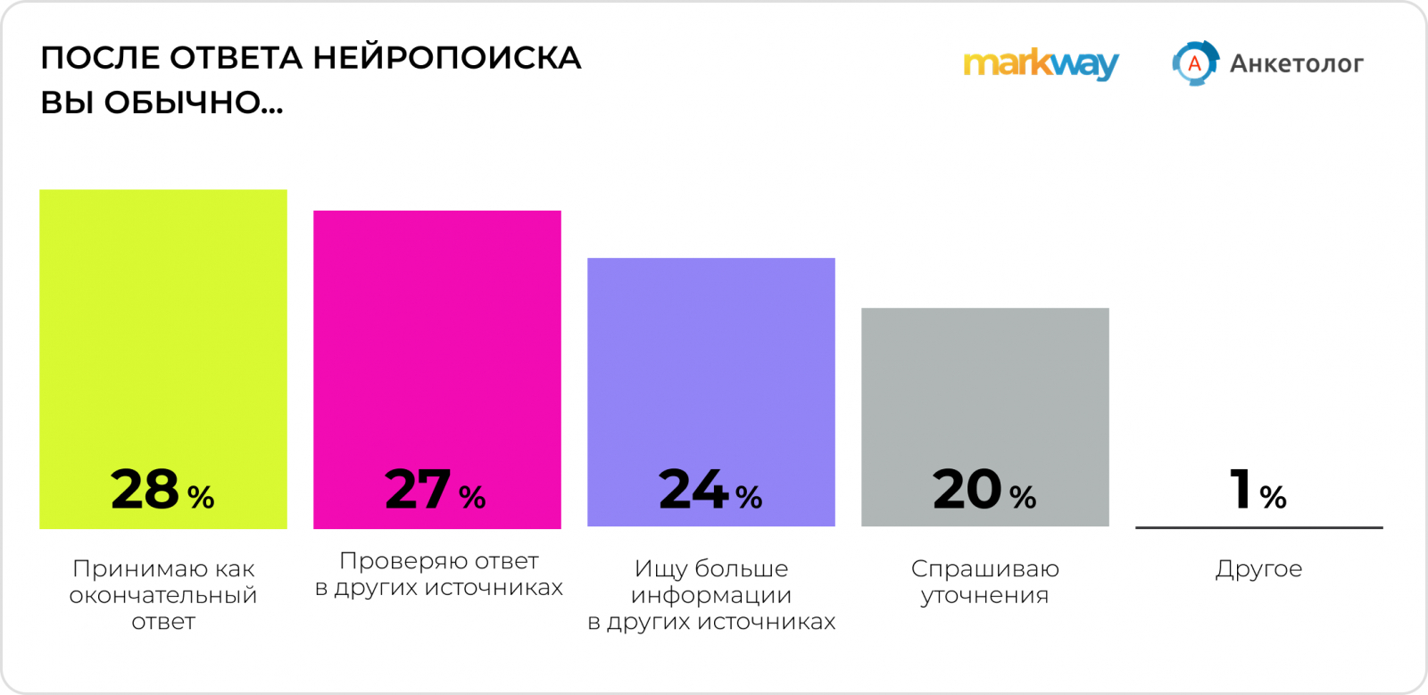 Однако доверие к результатам остается умеренным: лишь 28% принимают ответ как окончательный. Почти столько же предпочитают сверить информацию в других источниках. Пользователи ценят скорость и удобство, но пока не рассматривают нейропоиск как единственный авторитетный источник. Для них это скорее “точка входа” — инструмент для быстрого старта, после которого требуется дополнительная верификация.
