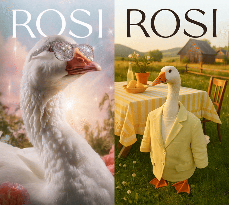 Мы решили провести эксперимент: создать серию креативов с помощью нейросетей. Главным героем которых стал гусь — символ летней коллекции ROSI 2025, персонаж в стиле fashion-editorial: немного абсурдный, харизматичный и запоминающийся, контрастирующий с типичной эстетикой fashion-рекламы.