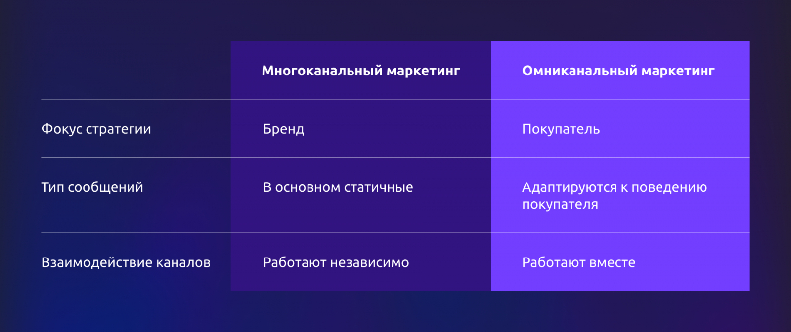 В омниканальном маркетинге основное внимание уделяется потребностям клиентов. Его главная цель в том, чтобы предоставлять персонализированные сообщения и обеспечивать бесшовный, унифицированный опыт. Это позволяет клиенту легко получить доступ к информации из любого канала, ведь они все связаны друг с другом.
