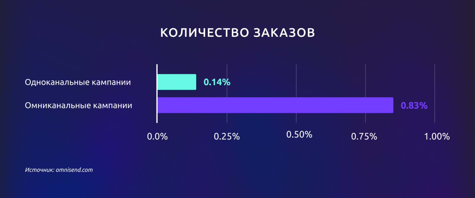 Несколько каналов продвижения облегчает клиентам поиск. В 2021 году Omnisend проанализировали 135 000 рекламных кампаний и выяснили, что у e-comm брендов, которые использовали 3 и более каналов, было на 494% больше заказов, чем у тех, кто использовал одноканальные стратегии.
