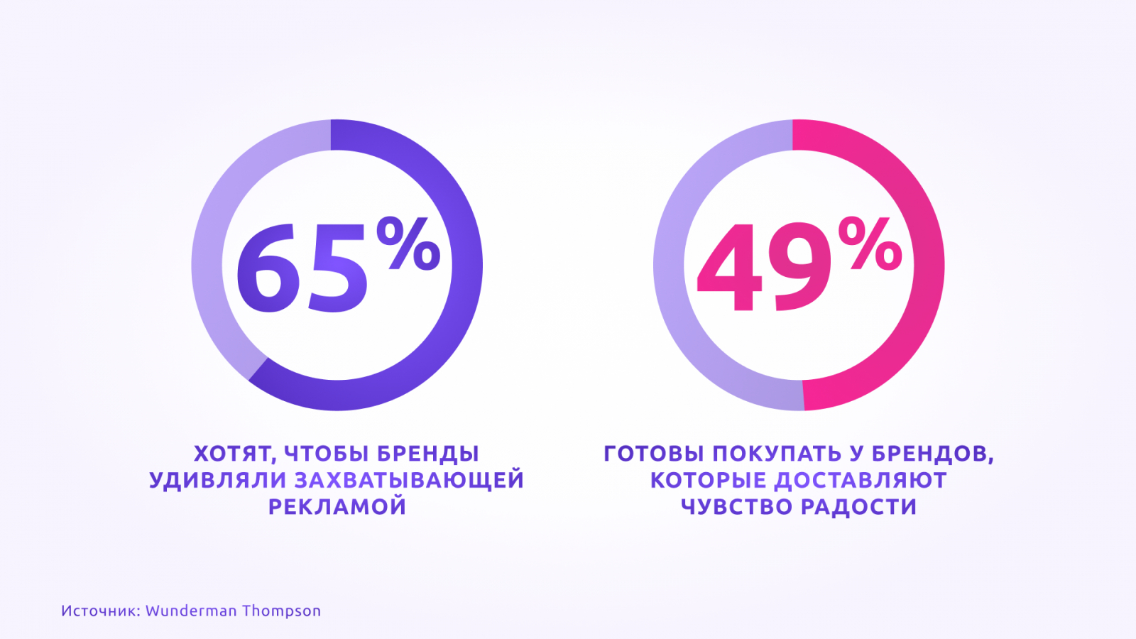 Казалось бы, и причем тут маркетинг? Оказывается, 65% людей хотели бы, чтобы бренды удивляли их захватывающей рекламой, а 61% — чтобы компании помогали им ощущать интенсивные эмоции. Почти вдвое больше людей готовы купить у брендов, которые дарят им чувство радости (49%) или удивляют (45%), чем у брендов, которые просто выполняют свои обещания (26%).