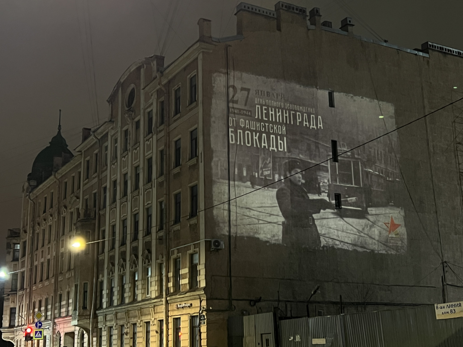 На фасады транслируют архивные снимки из жизни блокадного Ленинграда. Инсталляции будут включать по девяти адресам до 27 января по графику работы наружного освещения. Одна из них, например, на Новгородском проспекте в Шушарах.