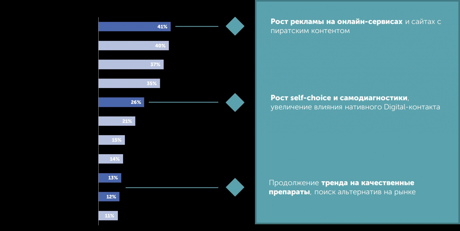 Фарма имеет ограниченный пул медиаинвентаря для продвижения продукции. Ситуация усугубилась блокировкой всем известных соцсетей и уходом некоторых подрядчиков с рынка. При этом открылись новые возможности для проведения кампаний:
