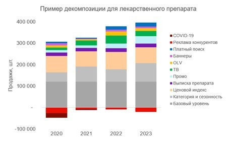 Одним из ключевых результатов эконометрического анализа является декомпозиция вклада факторов в модельную оценку независимой переменной. Для полноты картины рассматриваются как положительно влияющие, так и дающие отрицательный вклад факторы: рекламная активность конкурентов, макроэкономические потрясения, эпидемии и другие.