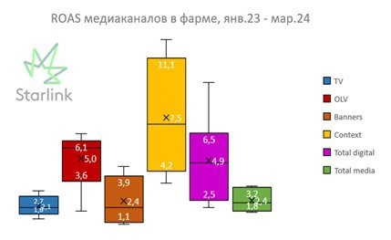 Результаты наших расчетов ROAS (отношение инвестиций в рекламу к полученной от них выручке) с начала 2023 года по белее чем десяти брендам лекарственных препаратов собрали на диаграмме размаха, которую часто называют «ящик с усами». Такой тип диаграмм часто используют в статистике для анализ агрегированных данных. Верхняя и нижняя граница «ящика» обозначают первый квартиль (такое значение, ниже которого только 25% оценок) и третий квартиль (такое значение, выше которой только 25% оценок). Горизонтальная линия между ними является медианой, а крестик – средним значением. «Усы» показывают результаты исследований с минимальным и максимальным значением ROAS по медиа.