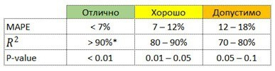 Недостаточно хорошие результаты тестов даже при высоких R2 и MAPE свидетельствуют о том, что полученные в модели оценки для факторов ненадежны.