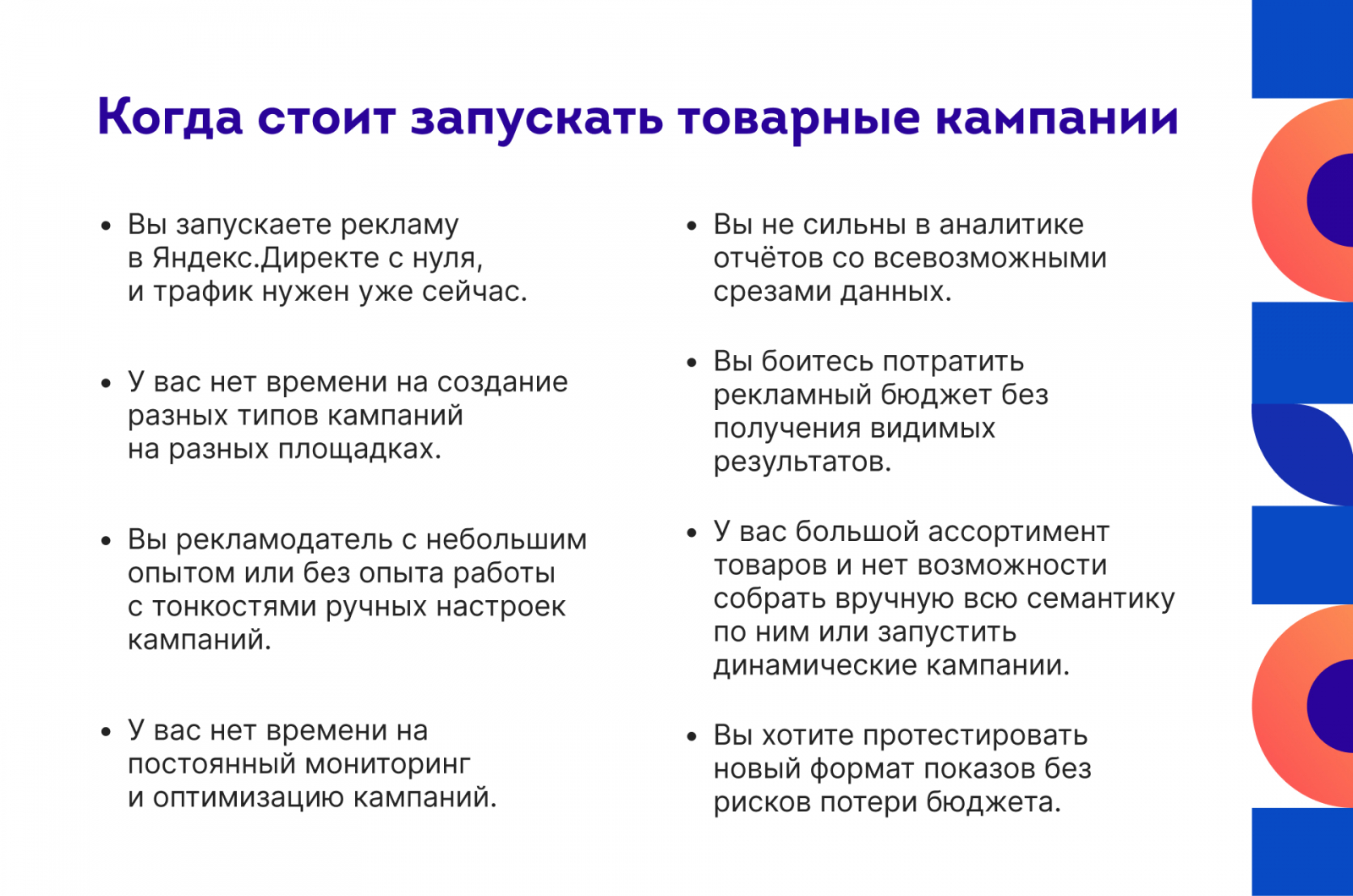 Если вы запускаете товарную кампанию параллельно с другими работающими, то система частично заберёт от них трафик. Поэтому результаты по другим кампаниям могут ухудшиться. Это не значит, что общий результат и эффективность от товарной кампании отрицательные. Чтобы это проверить, нужно проанализировать трафик в отчёте по старым кампаниям и сравнить показатели новой товарной кампании. А после соотнести результаты от внедрения нового инструмента.
