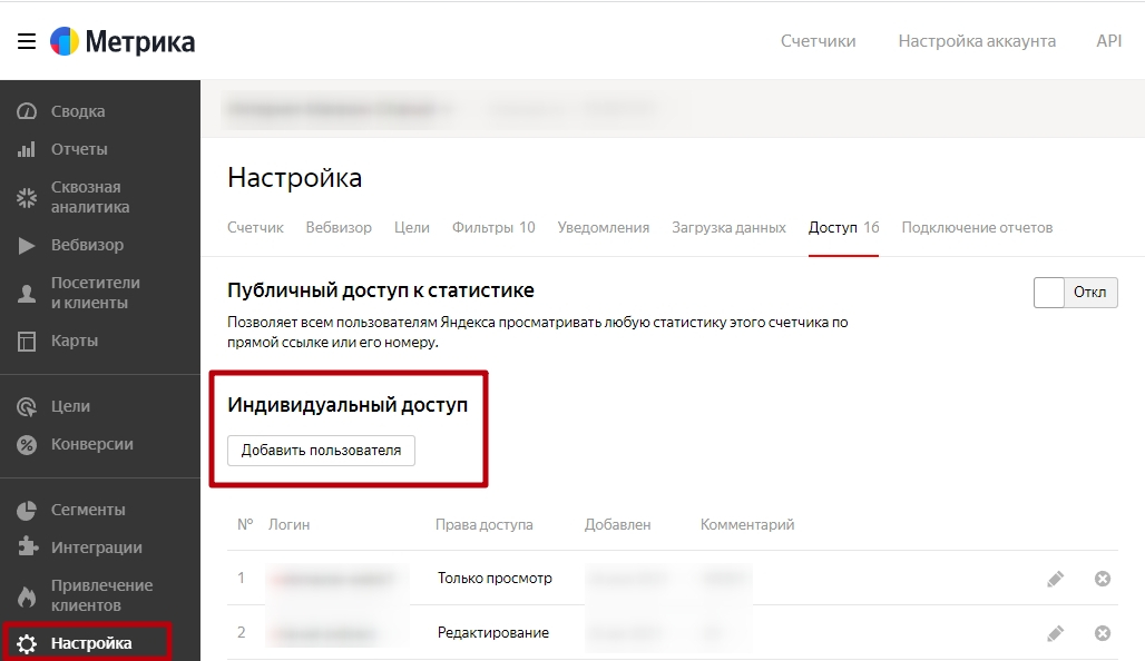 3. Разрешить Яндекс.Директу пользоваться целями Яндекс.Метрики. Для этого нужно предоставить индивидуальный доступ: добавить логин пользователя рекламного аккаунта. Если у вас включён тумблер «Разрешить оптимизацию по целям без доступа к счётчику», то это необязательно.