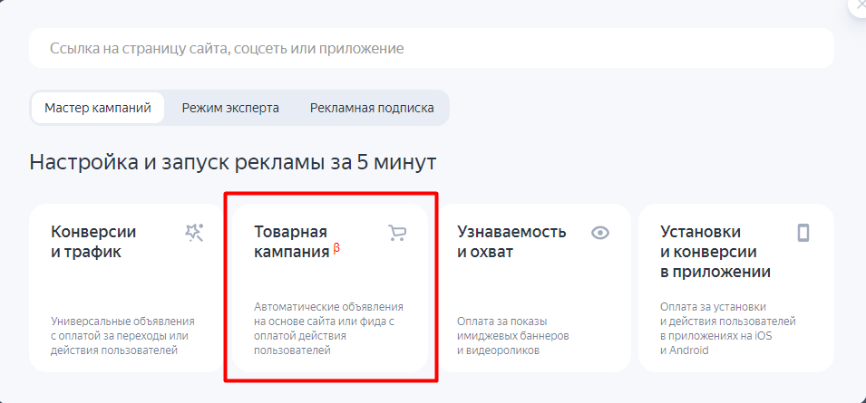 1. В рекламном кабинете в разделе «Мастер кампаний» выберите «Товарная кампания» и укажите ссылку на рекламируемый сайт.