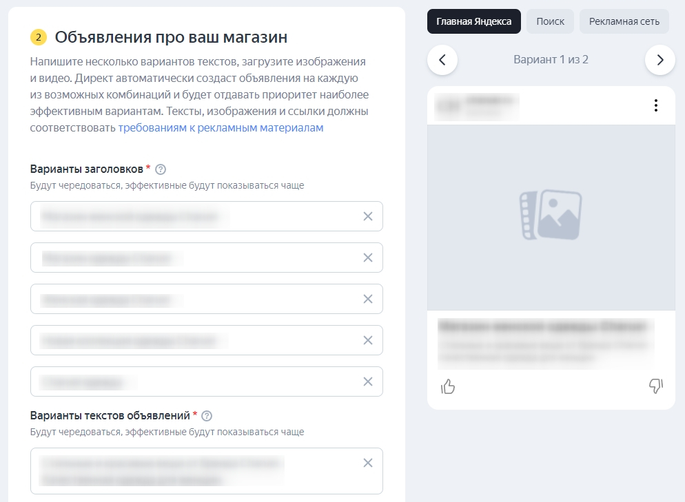 Мы рекомендуем заполнять все пункты максимально подробно для улучшения качества объявления. Если вы в этом не сильны, то Яндекс.Директ может помочь и автоматически всё заполнить. Останется только скорректировать данные и проверить фразы на логичность и информативность.
