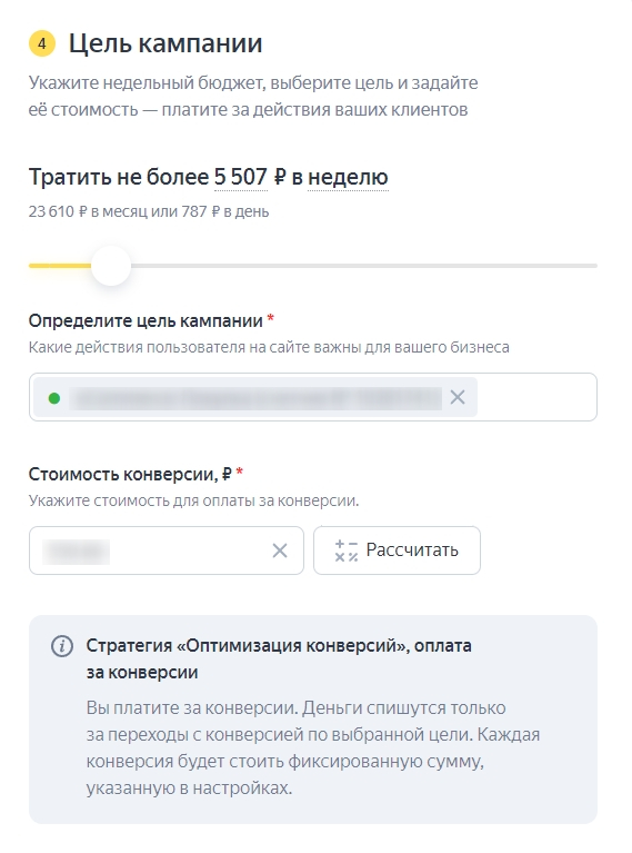 Бюджет необходимо выставить из расчёта – 10 конверсий х стоимость 1 конверсии. Для корректного обучения системе нужно получать не менее 10 конверсий в неделю по выбранной цели.
