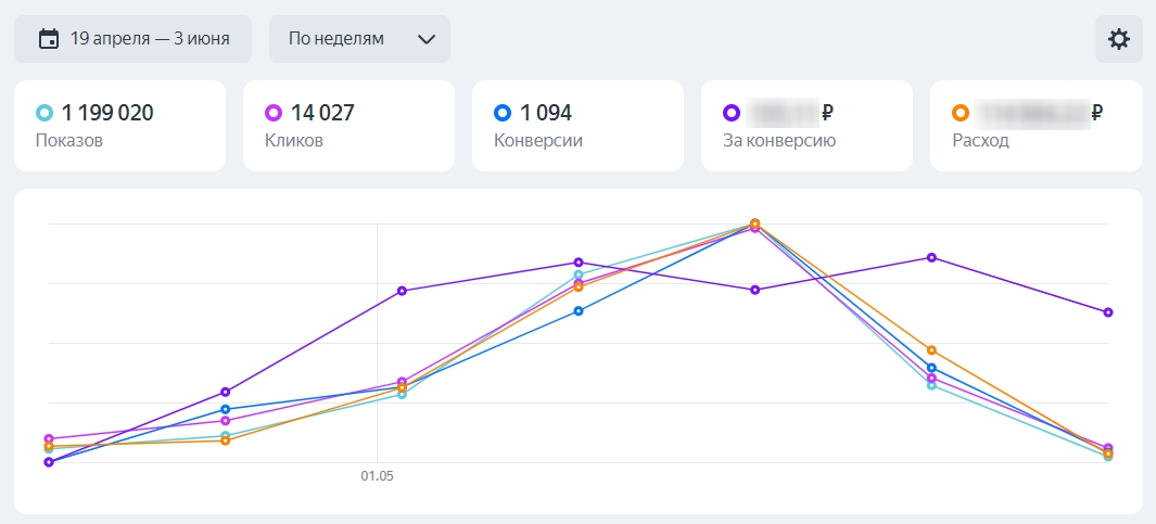 Через две недели после запуска кампании уже можно увидеть первые результаты. Для этого необходимо выбрать интересующие вас данные, которые будут отображены на графике.