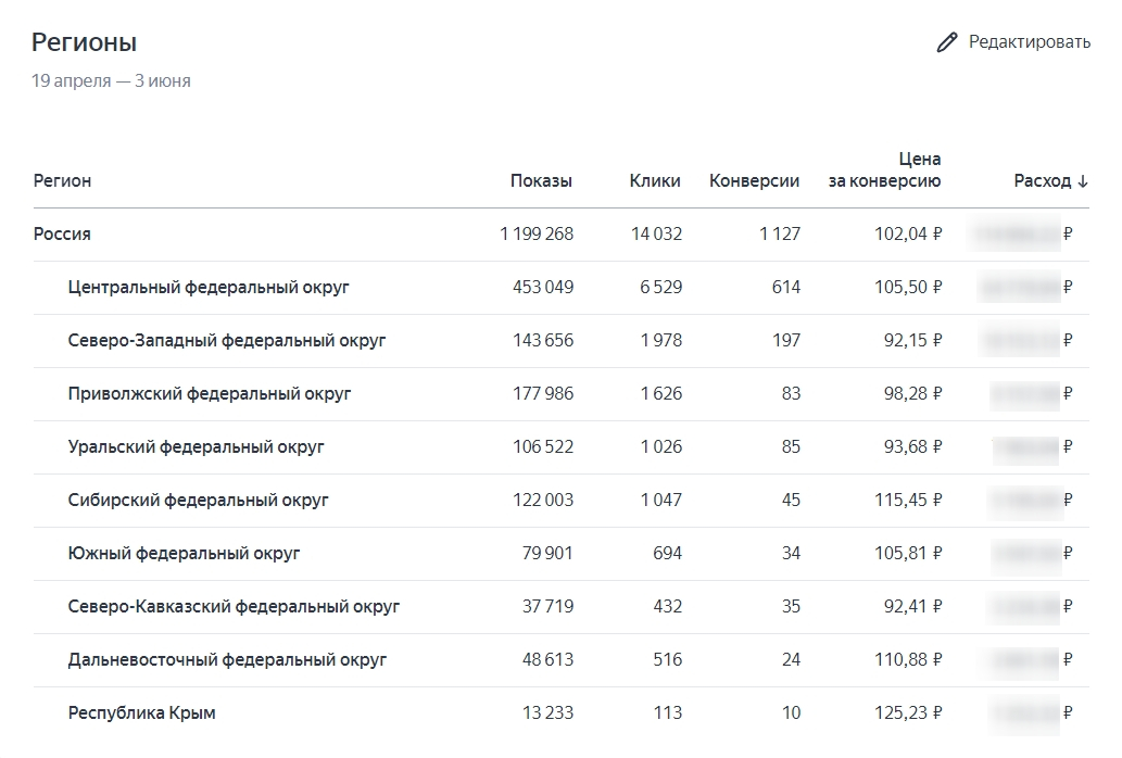 В конце страницы находятся развернутые данные по географии показов. Иногда количество целевых действий в одном регионе значительно выше относительно других. Мы рекомендуем выделить этот регион в отдельную товарную кампанию. Так можно достичь снижения средней цены конверсии и подобрать более релевантные тексты и креативы для объявлений.