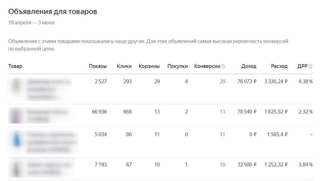 После графика следует сводка по объявлениям товаров. Система показывает товары наибольшего спроса, доход от них и долю рекламных расходов.