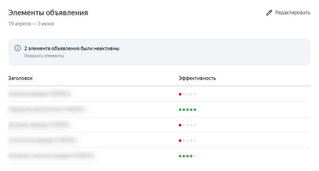 Под данными о товарах находится сводка по эффективности объявлений: отдельно всех вариантов заголовков, текстов и изображений. Опираясь на эти данные, можно скорректировать неэффективные элементы объявления, заменив их на другие для проведения A/B тестов.