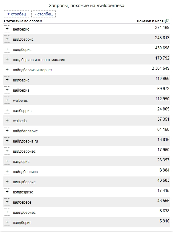 Существуют такие компании или товары, с названием которых у пользователя возникают сложности, и они их пишут с опечатками. Например, у «Wildberries» есть более 15 вариантов написания бренда. Самые популярные: валберис, вилдберрис, велберис, вилдберис. Поскольку алгоритмы Яндекса осведомлены о корректном написании и статистики для анализа пользовательских запросов у них достаточно, система предлагает исправление. Но сам запрос является уникальным и не отменяет того факта, что показ инициирован именно по нему, а не по исправленному варианту. Опираясь на этот факт, можно сделать вывод, что использование дополнительных фраз в контекстной рекламе поможет укрепить бренд, а также показать релевантное объявление и направить пользователя на нужную посадочную страницу, например, если запрос содержит интент «бренд + категория».