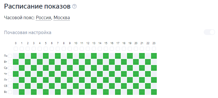 В рекламной кампании необходимо выставить настройки по часам показов на всю неделю в шахматном порядке, чтобы получить данные из Яндекс.Метрики по активности.