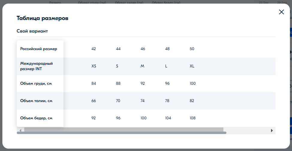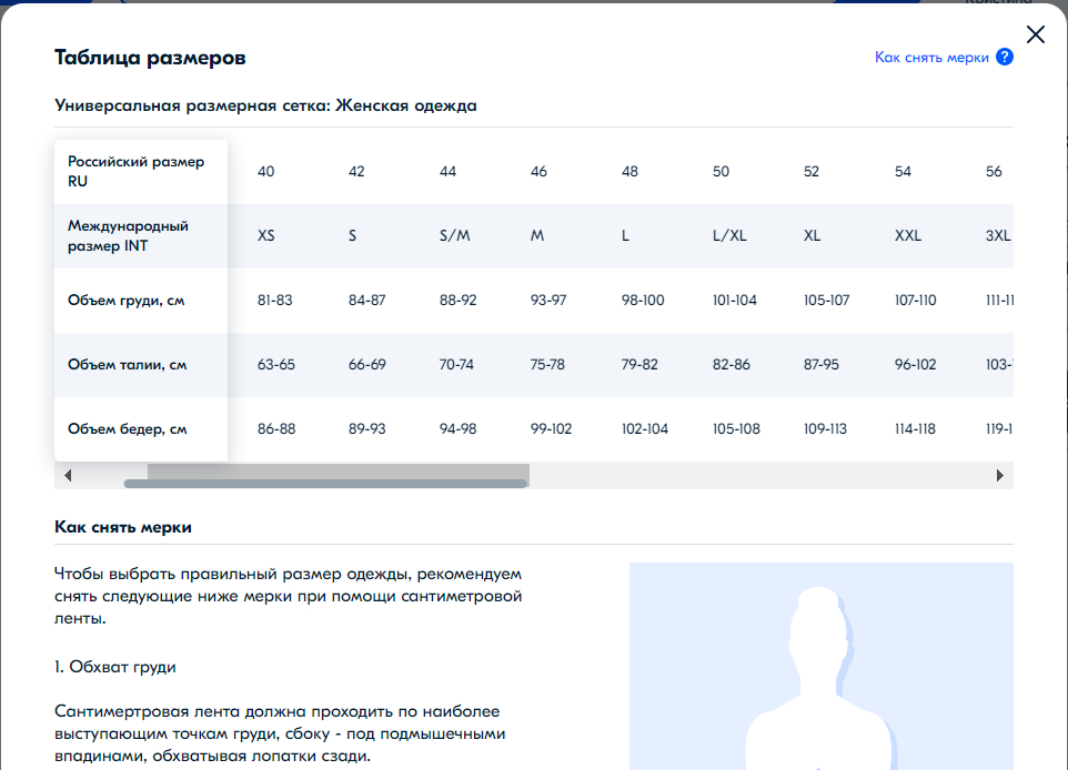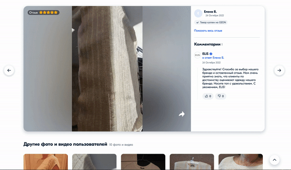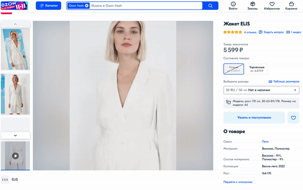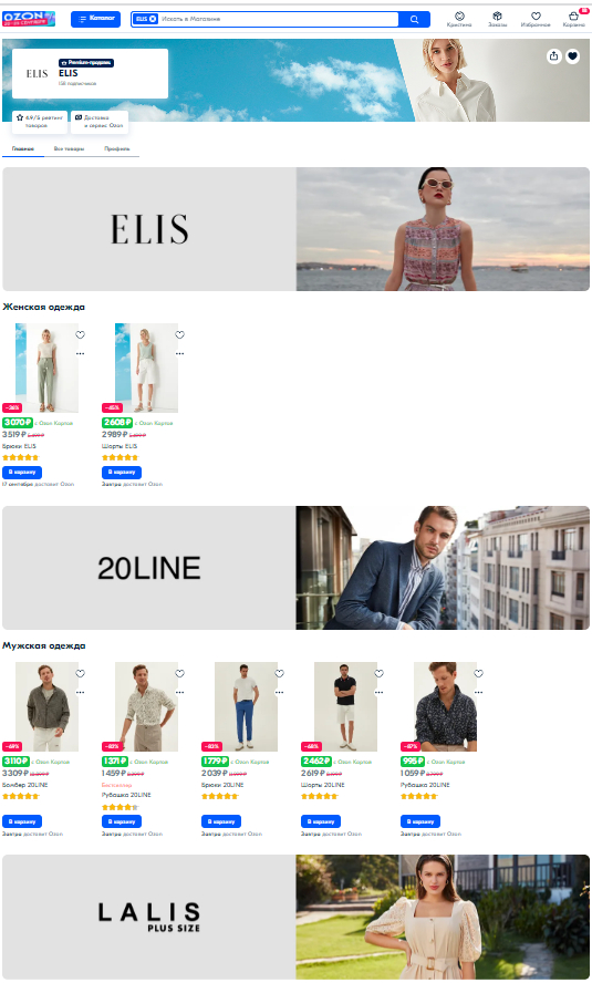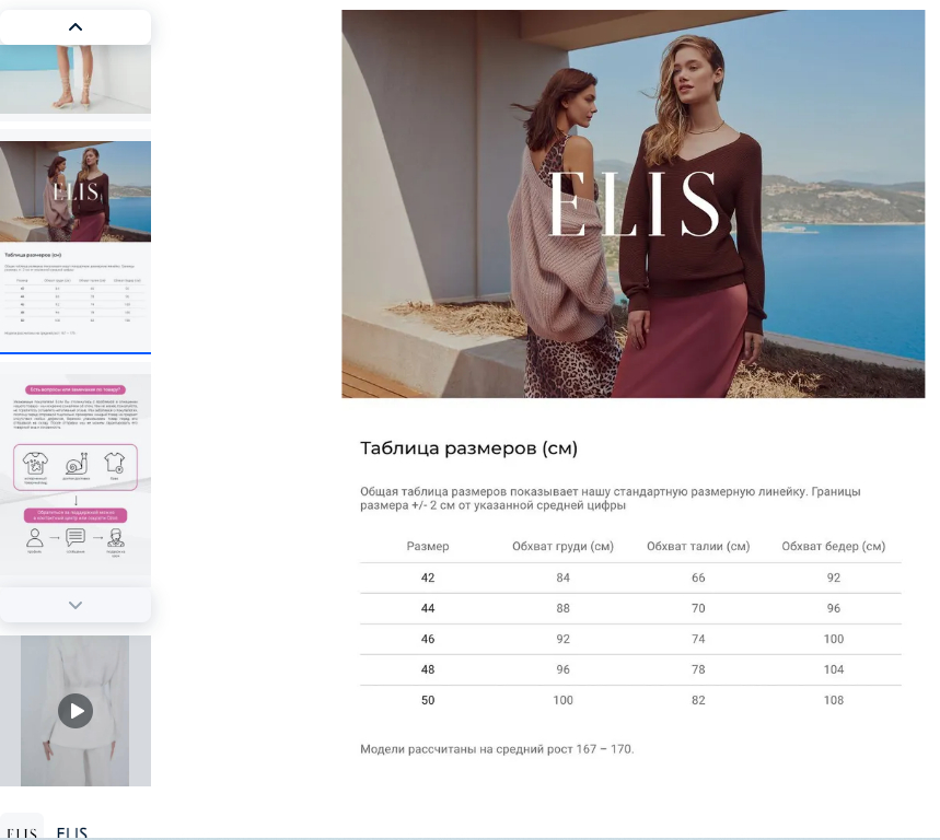 На Ozon есть таблица размеров, которая не всегда соответствует варианту магазина. Например, для ELIS размер 42 – это XS, а на Ozon 42 – S. Чтобы снизить вероятность возврата из-за неподходящего размера, нужно добавить размерную сетку бренда фотографией в карточку товара.
