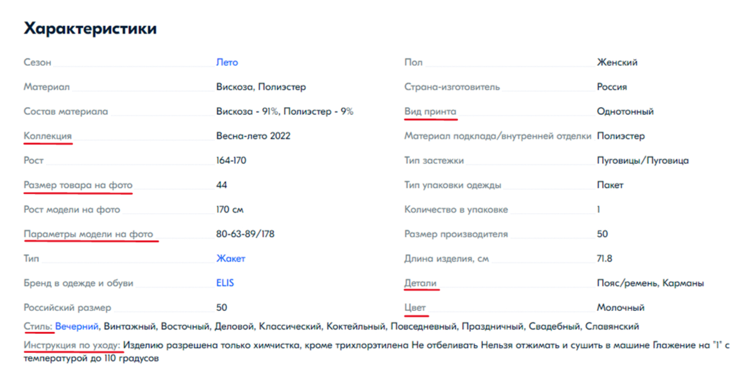 Для того чтобы сделать карточку более привлекательной для пользователей и алгоритмов площадки, мы провели работы по заполнению характеристик товара. Обязательны для заполнения следующие поля: