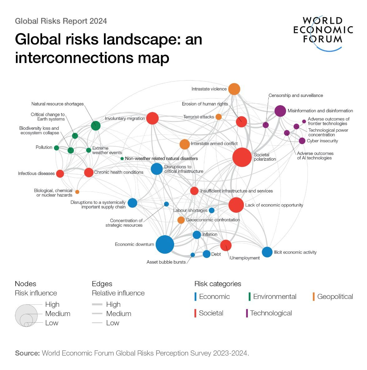 В ближайшие два года ключевыми рисками являются дезинформация, экстремальные погодные условия, поляризация общества и межгосударственные конфликты. На фоне этого стоят проблемы инфляции, миграции, экономического спада и загрязнения окружающей среды, которые в значительной мере обусловлены дезинформацией и дезинформированием общества.