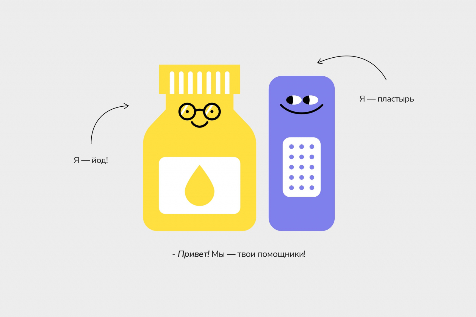 В основе дизайна — милые персонажи — Йод и Пластырь. Это герои, помогающие найти подходящие лекарства каждому клиенту. Они добавляют концепции теплого настроения. Выглядят по-доброму, оптимистично, а еще улыбаются, что также усиливает доверие.