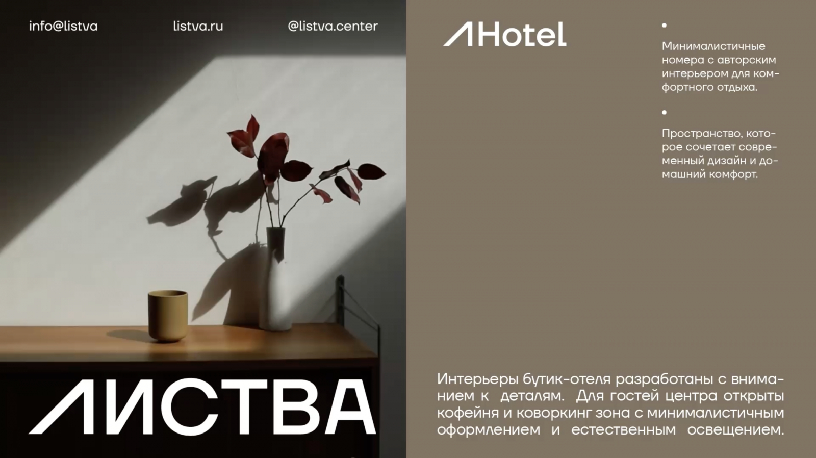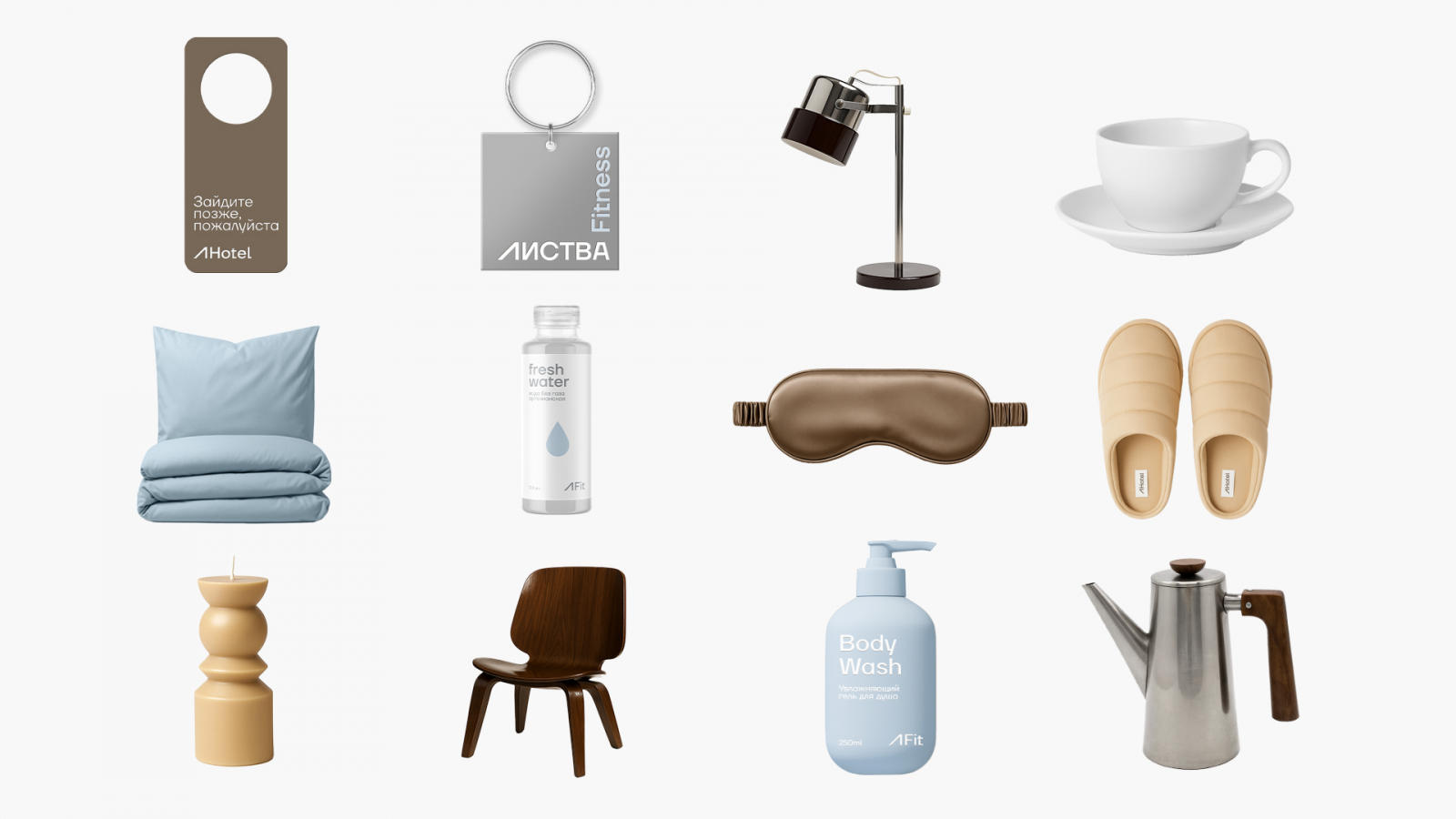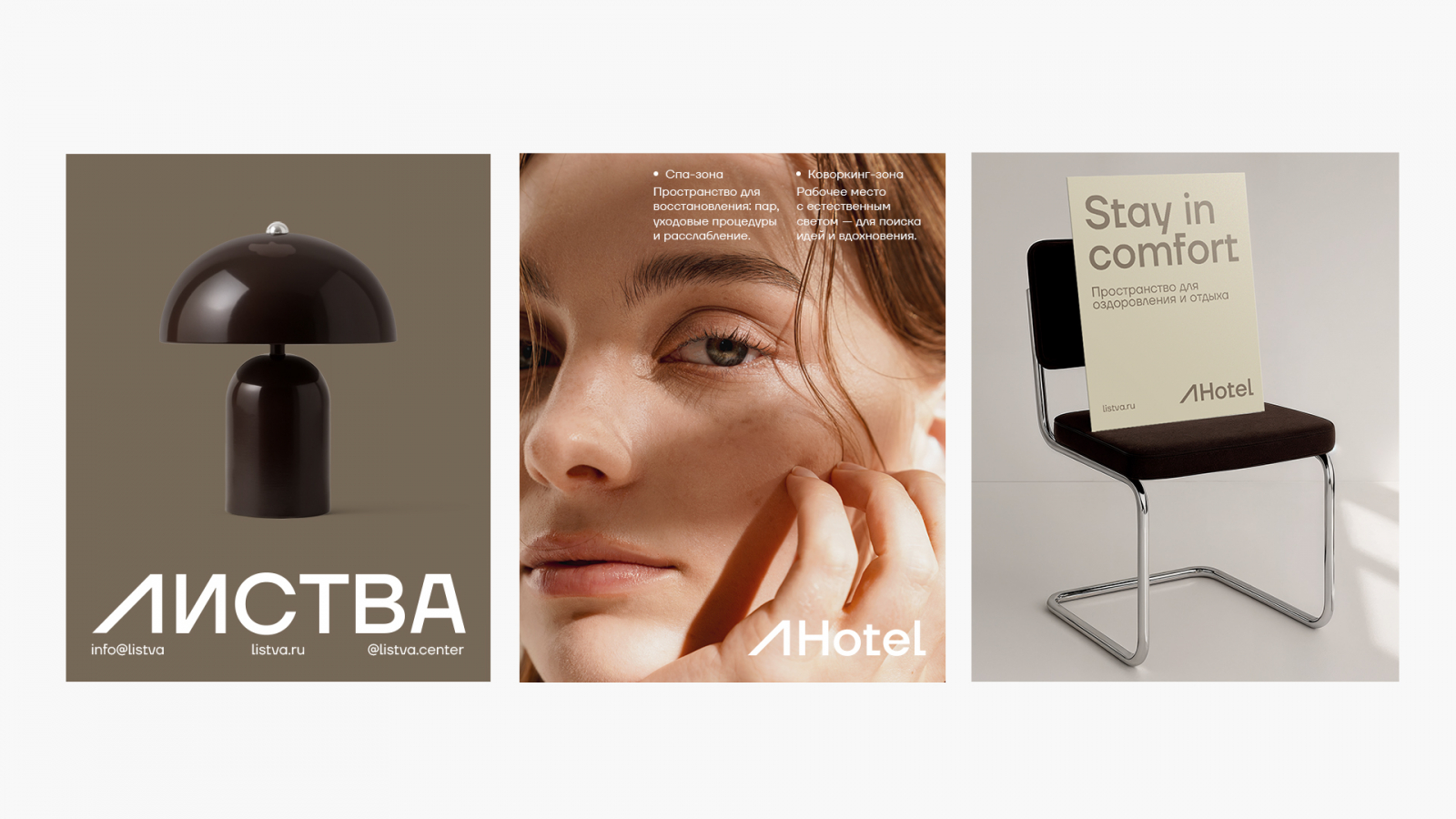 Айдентика отельного направления «Листвы» строится вокруг идеи защищённого уединения. Это не просто место для ночёвки — это возможность остановиться, перезагрузиться и вновь почувствовать контроль над собственной жизнью.Цветовая палитра — глубокий коричневый и оттенки мокрого камня — отсылает к уюту, теплу и естественному окружению. Эти цвета не агрессивны, не холодны — они создают ощущение тактильной безопасности и визуальной тишины.Минимализм — не ради эстетики, а как проявление уважения к личному пространству. Все элементы айдентики — от вывески до этикетки геля для душа — говорят: «ничего лишнего». Это язык, понятный тем, кто устал от визуального шума и хочет быть в фокусе сам для себя.