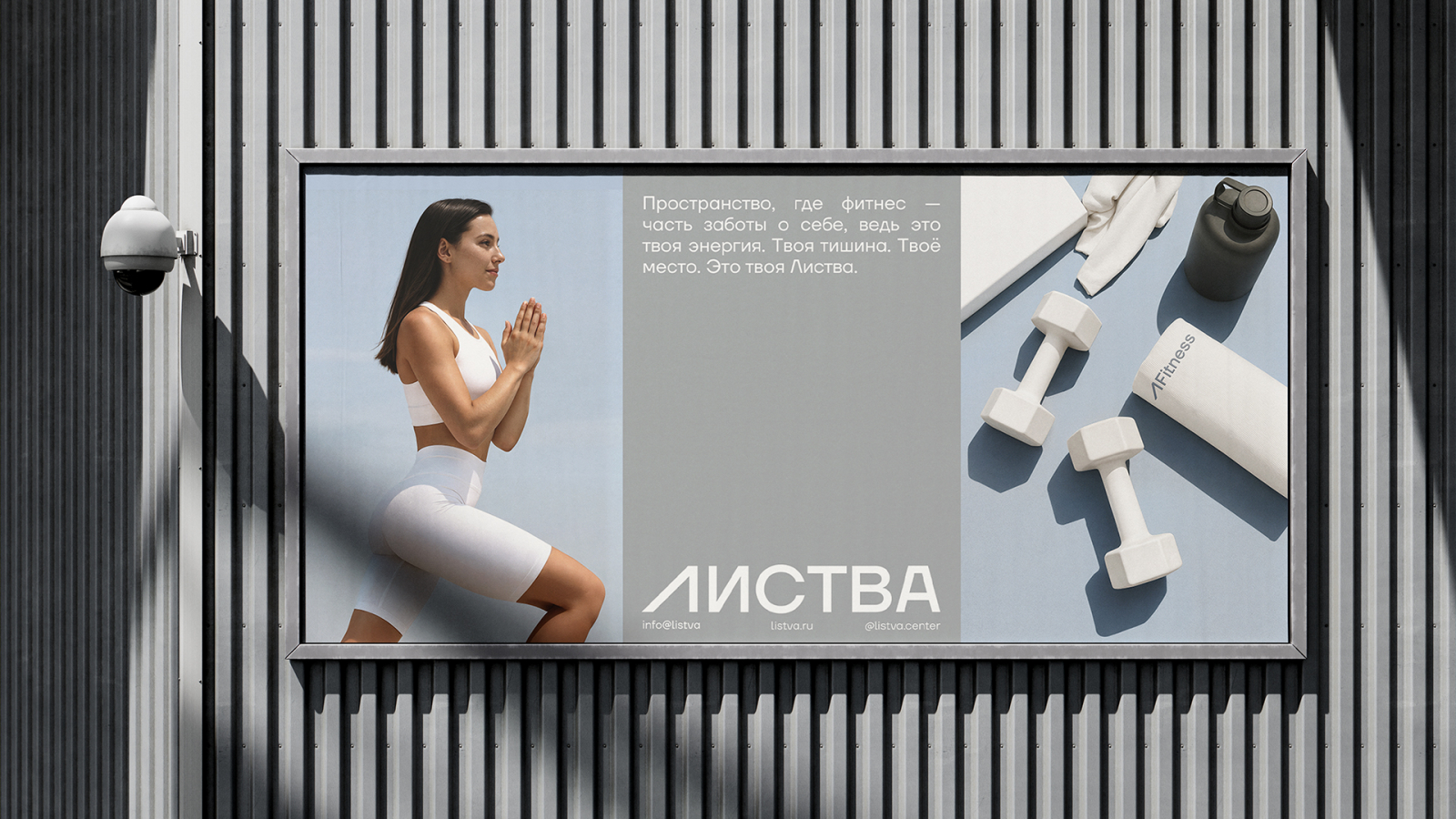 Фитнес-направление «Листвы» — не про нагрузку и достижение результатов. Это про возвращение к телу и восстановление. Мы заложили в дизайн именно это ощущение: не спортзал, а поддерживающая среда, где всё нацелено на комфорт, безопасность и бережное движение.Цветовая палитра — холодный голубой и светло-серый — подчёркивает ощущение воздуха, контроля и тишины. Он выделяет Fitness в системе, но не выбивается из общего бренда — создавая ощущение гармонии и связности.Мы выбрали инклюзивную эстетику: никаких агрессивных форм. Фотографии и графика передают мягкую концентрацию, интимность, контакт с собой. Свет — естественный, рассеянный, будто после дождя.
