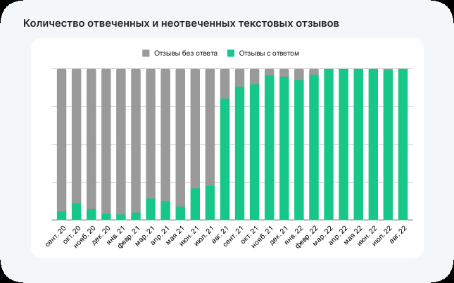 1. Ответ в тот же день. Отзывы поступают каждый день, и нам важно оперативно отвечать пользователям. Отзывы собираются со всех площадок в личный кабинет Поинтера, уведомления о поступившем отзыве мы получаем в почту, также можно настроить нотификации в мессенджеры. До подключения обрабатывалось лишь 23% всей обратной связи, сейчас этот показатель составляет 100%.