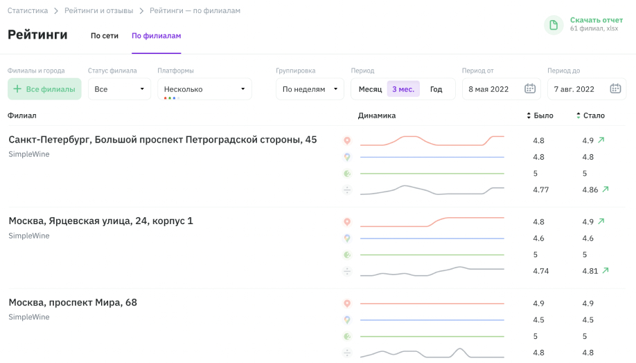 Обратная связь наших клиентов влияет на рейтинг компании. Скакать по карте по 60 с лишним филиалам каждый день не очень удобно, а с помощью статистики в личном кабинете Поинтера мы легко отслеживаем динамику изменения рейтинга по всей сети и также отдельно по филиалам. Это позволяет нам контролировать ситуацию и работать на нашу репутацию.