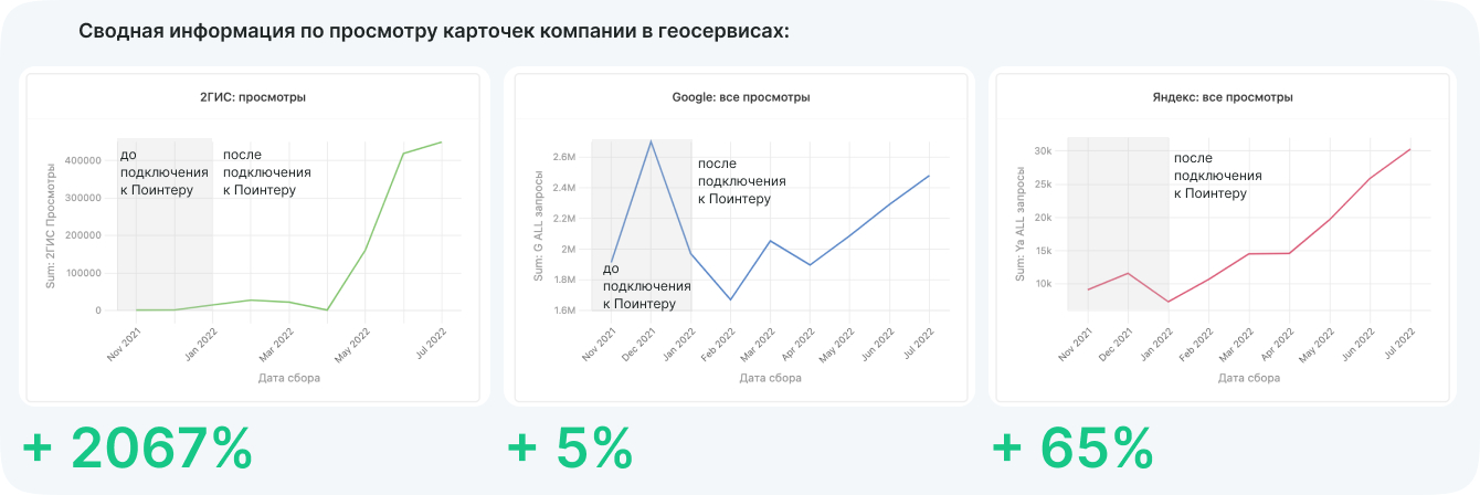 В Яндексе просмотры карточек выросли на 65%, в 2ГИС — на 2067% и в Google — на 5%.