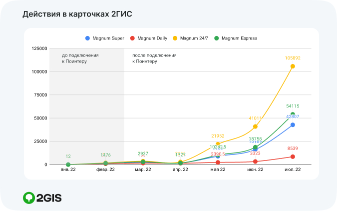 В среднем магазины Magnum посещает около 3,5 миллионов потребителей в месяц. И несмотря на то что основной поток клиентов приходит напрямую в точки продаж, не пользуясь онлайн-поиском или геосервисами, компания видит необходимость в выстраивании работы в этом направлении: это важно для имиджа и построения образа современного бренда.