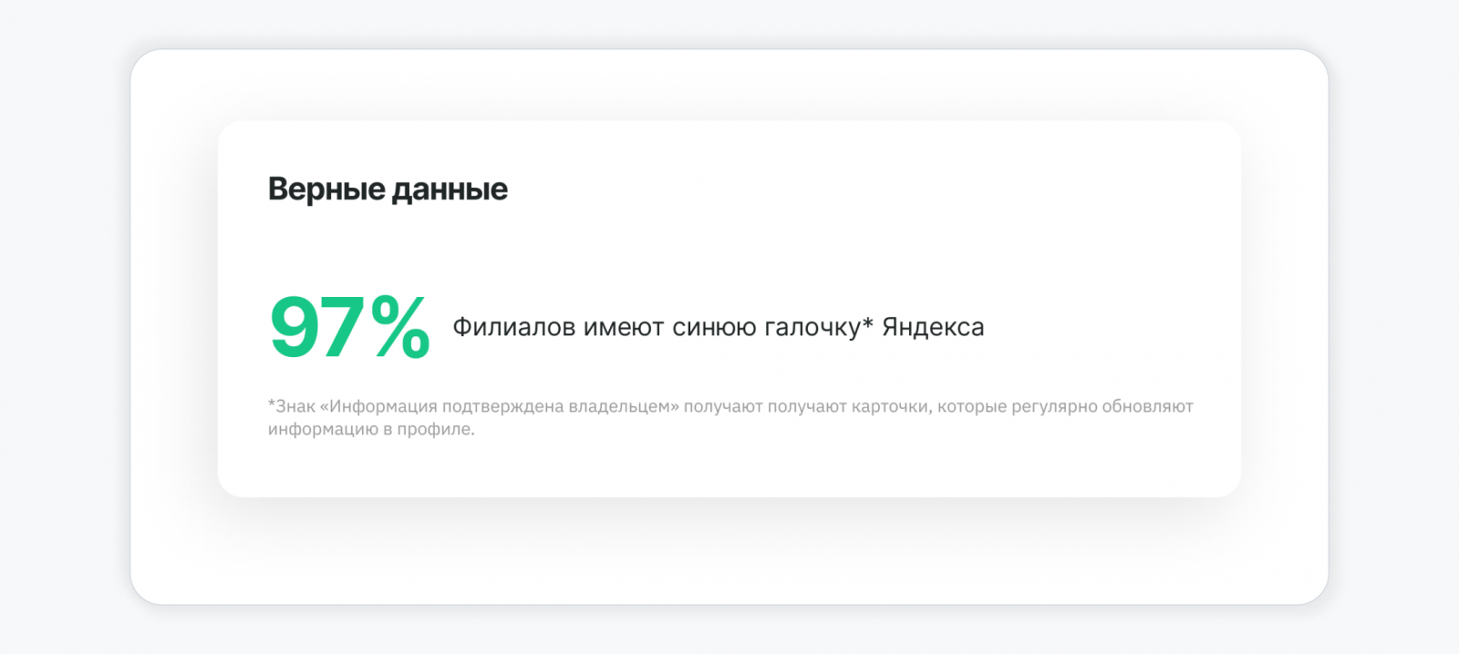 4. 97% филиалов с синей галочкой Яндекса имеют верные данные.