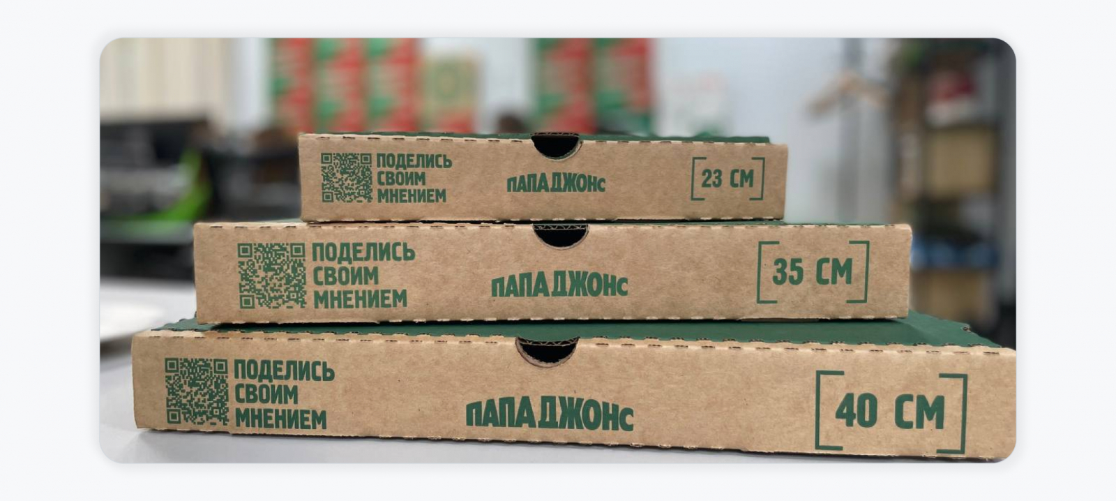 QR-код Активатора отзывов расположен на коробке с пиццей и в самих ресторанах на разных маркетинговых материалах (бокстоперах и др.). Партнеры сами выбирают формат промоматериалов, но дизайн всегда разрабатывает головной офис.