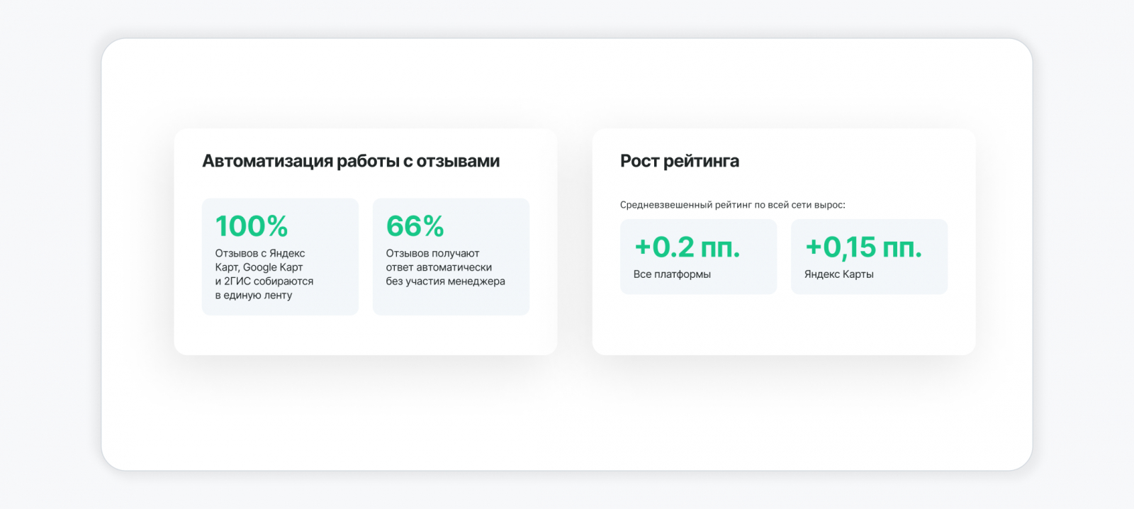 Для отзывов с 5 звездами мы подключили автоматические ответы: загрузили несколько шаблонов, и они отправляются без участия сотрудника. Сейчас 66% отзывов именно так и обрабатываются — это значительно экономит время сотрудников.