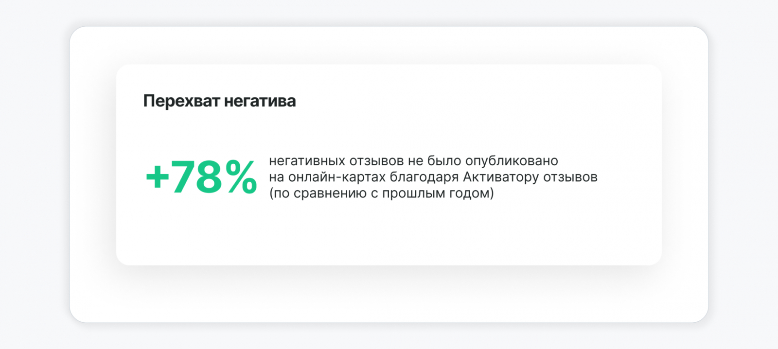 За год через Активатор отзывов мы получили около 1500 отзывов. Отрицательные отзывы были направлены в отдельный канал и не были опубликованы в онлайне. Наши менеджеры моментально получили жалобы и обработали их. Таким образом нам удалось значительно сократить долю отрицательных отзывов на онлайн-картах и повысить рейтинг.