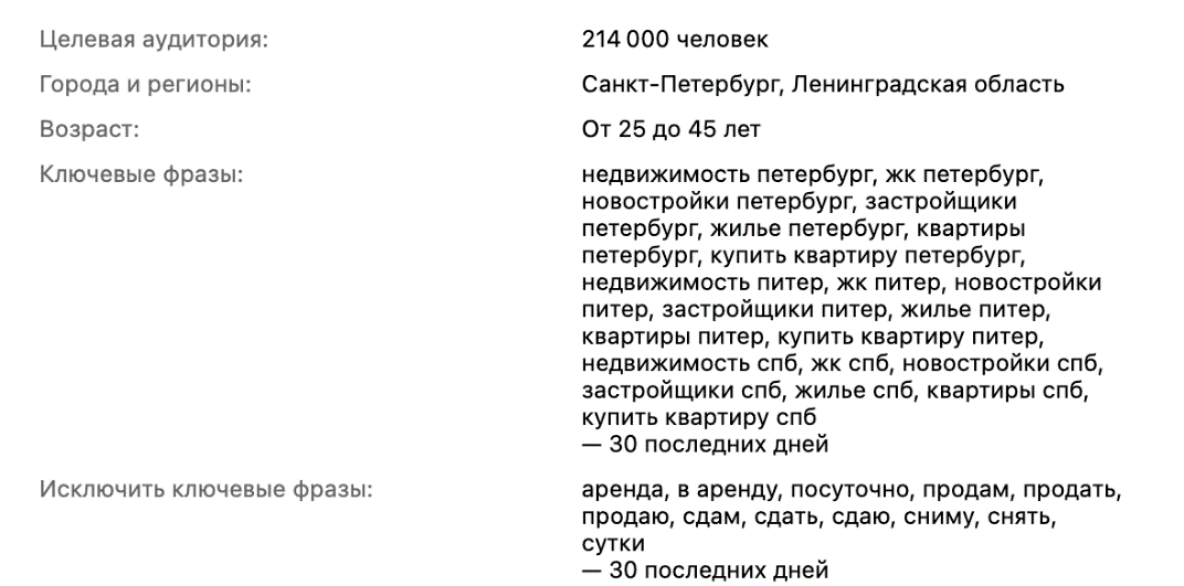 Тестируя многие варианты аудиторий, наше агентство адаптировало их под текущую реальность. В связи с расширением доступного охвата большую важность стал играть контекстный таргетинг. Работаем как с узкими и горячими ключами (бренд), так и с более широкими (покупка жилья, ипотека и т.д). Для УТП под конкретную аудиторию тестируем также специфические ключи, но их объем, как правило, невысок. Пример, ключи по теме «материнский капитал» для аналогичного УТП.