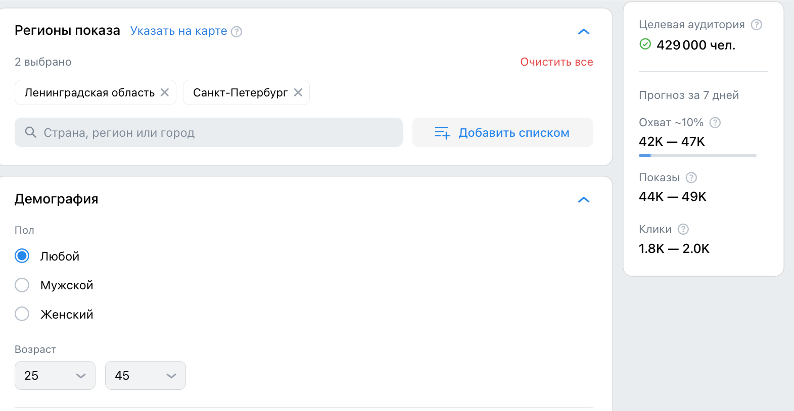 Ключевым нововведением стало расширение площадок показа рекламных объявлений. И если с оптимизацией алгоритмов дела обстоят с переменным успехом, то новые возможности для увеличения охвата аудитории – однозначный плюс. VK Ads позволяет запускать рекламу не только в соцсетях «ВКонтакте» и «Одноклассники», но и во всей рекламной сети VK, включая проекты Mail.ru, «Юлу», «Авито», «Авто.ру», «Едадил» и «Дзен». Посмотрим, как это влияет на охваты на примере аудитории жителей Санкт-Петербурга и Ленинградской области 25–45 лет, которые за последние 30 дней интересовались покупкой недвижимости в Северной столице. Охват по этой аудитории в новом кабинете более чем в 2 раза выше, чем в старом, что дает больше возможностей для активной работы с инструментом.