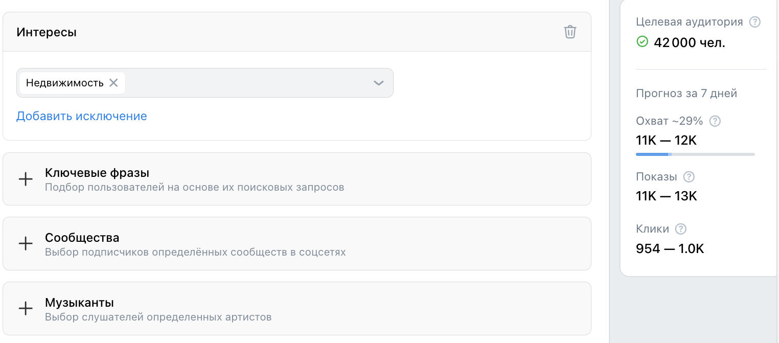 По тематическим таргетингам охват в «Одноклассниках» не слишком большой. Так, по интересу «недвижимость» сервис находит всего 42 000 пользователей. Однако в более широких аудиториях (супергео и аудиториях без дополнительного таргетинга) отдельно выбранные кампании по этой соцсети могут приносить качественные обращения в рамках KPI, пусть и в небольшом количестве.