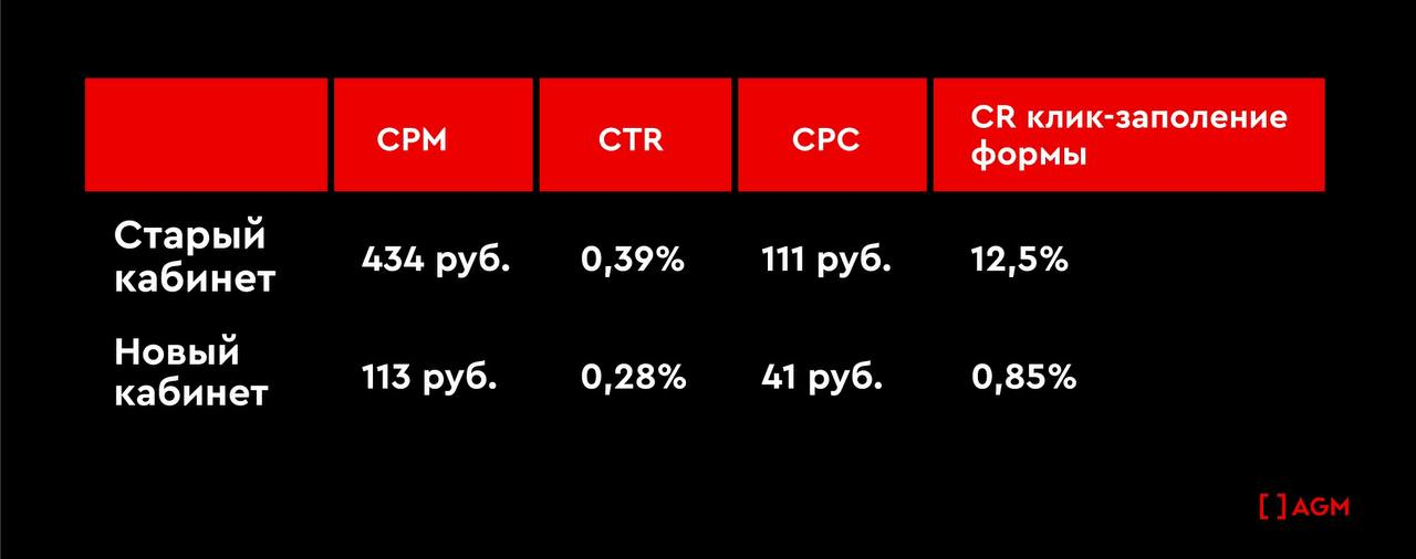Например, сразу после перехода на новый кабинет СPM уменьшился почти в четыре раза, а стоимость клика – более чем в 2,5 раза. Проблема в том, что конверсия из клика в первичную заявку сократилась еще сильнее – почти в 15 раз. В результате стоимость обращения с нового кабинета оказалась выше, чем со старого.