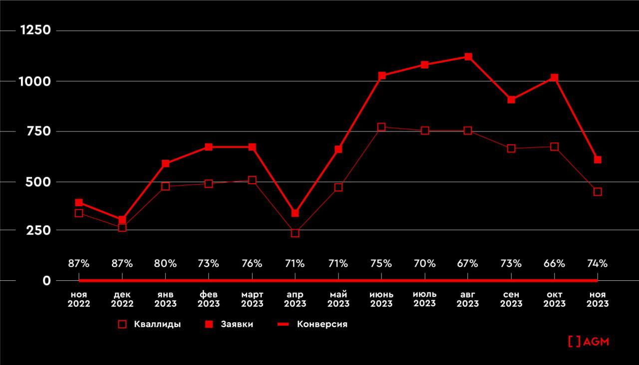 Полный переход на новый кабинет VK Ads потребовал от наших маркетологов значительной корректировки в тактике ведения рекламных кампаний. Тем не менее, опыт, умение быстро реагировать на обновления и продуманный подход к оптимизации рекламных размещений позволили нам быстро адаптироваться к новым условиям и извлечь максимум пользы из преимуществ сервиса – расширения площадок показа рекламы, универсального формата рекламной записи и прочих фишек. Сейчас мы можем с уверенностью утверждать, что наши опасения начала 2023 года не подтвердились – к счастью. Более того, результат от работы с новым рекламным кабинетом оказался весьма впечатляющим: объем обращений с ноября 2022 года по ноябрь 2023 года вырос в 1,4 раза