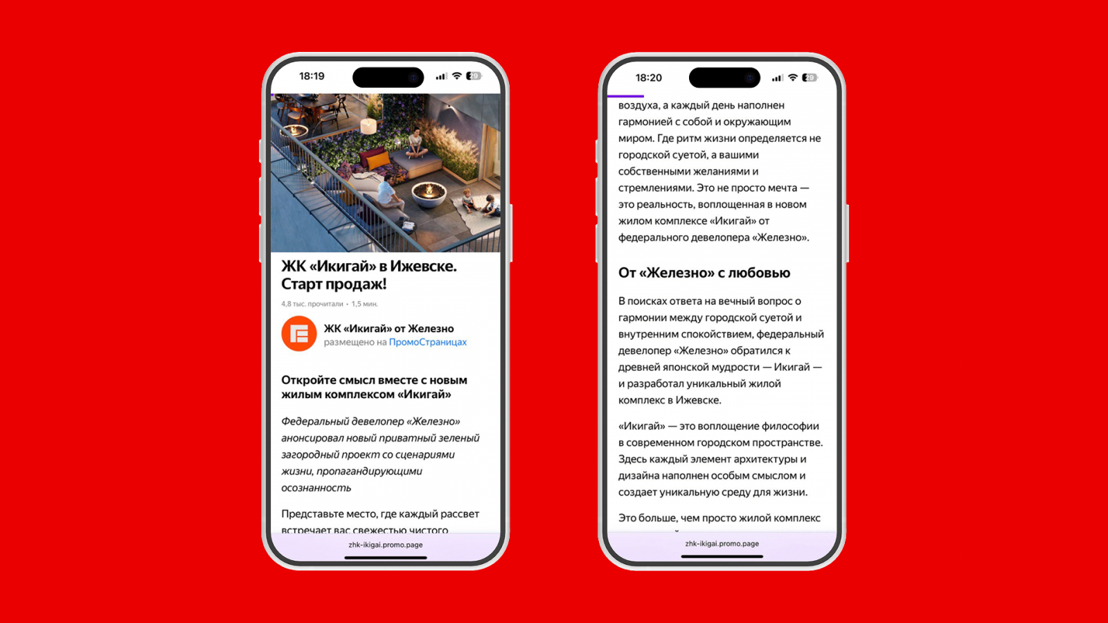 Для продвижения сделали одну ПромоСтраницу: «ЖК “Икигай” в Ижевске. Старт продаж!». В условиях ограниченного бюджета решили сосредоточиться на сильной, подробной статье, а не распыляться на несколько коротких материалов.
