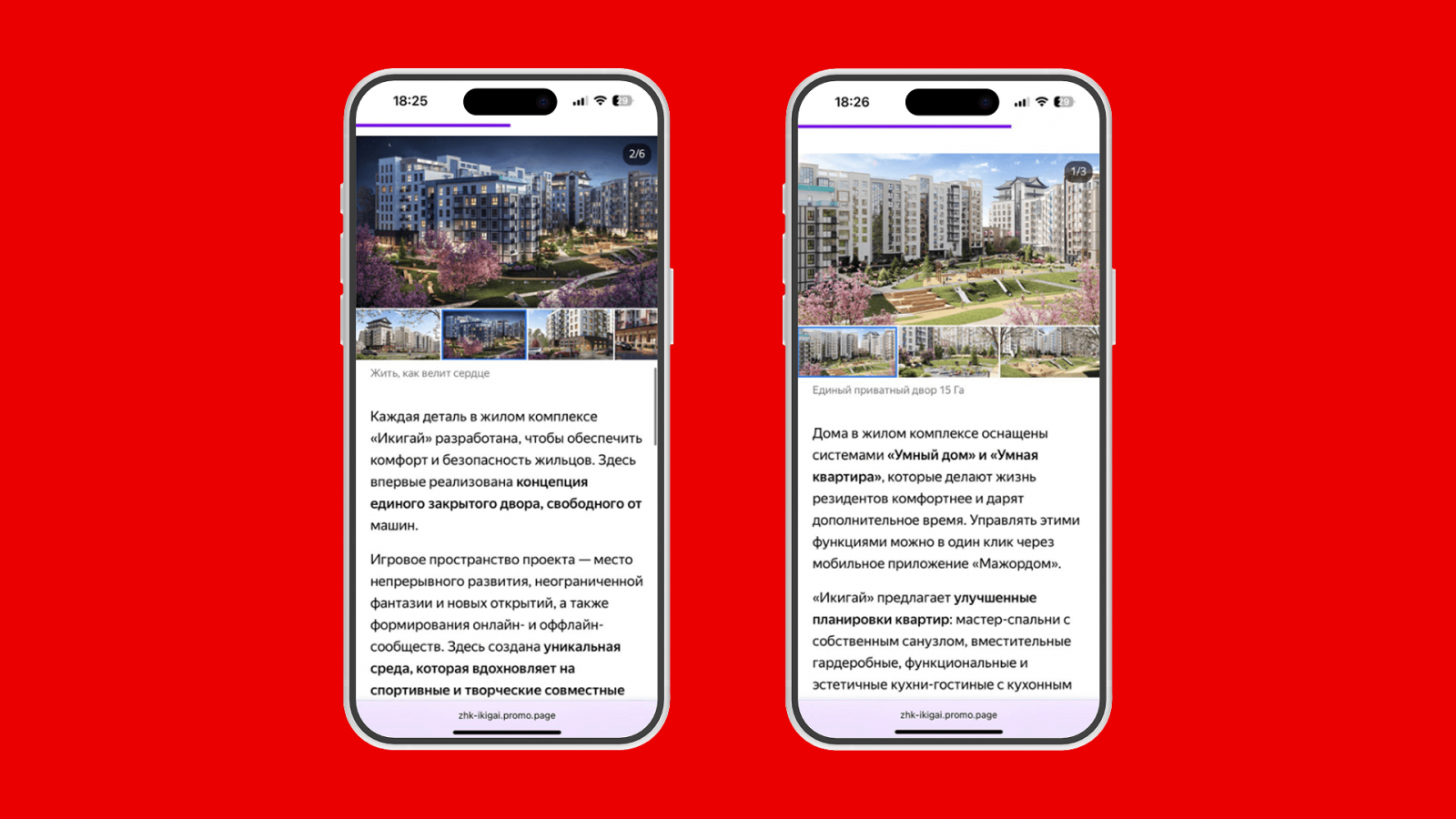 5. Узкий коридор коммуникации. Акцент сделали на ПромоСтраницу и визуал в ней — поэтому было особенно важно правильно подать жилой комплекс и настроить показы, чтобы обеспечить стабильный приток лидов.