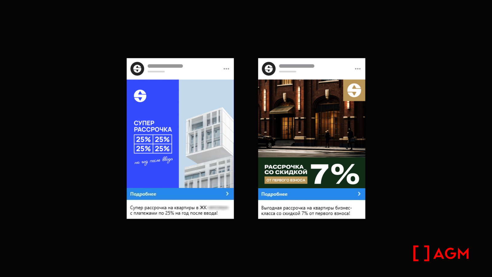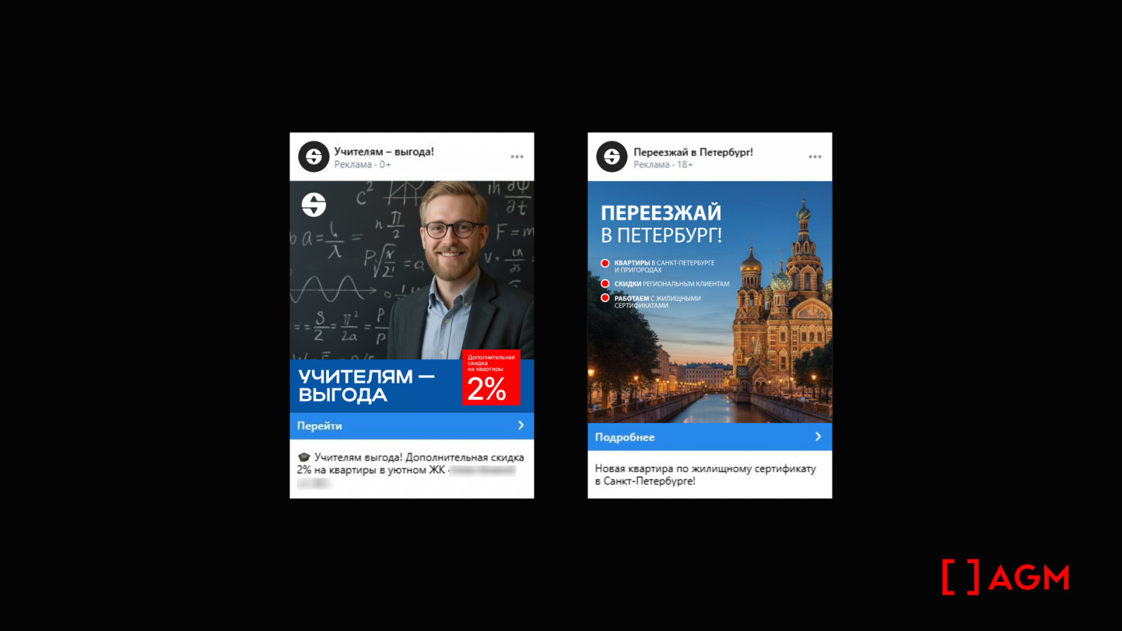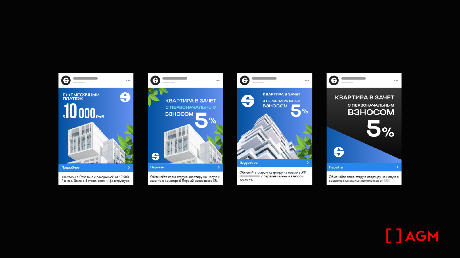 В качестве формата выбрали баннеры: при низком CPM (от 70 ₽ без НДС) они обеспечивают хороший охват даже на небольших бюджетах — в 2–2,5 раза дешевле Lead Ads. Основной таргетинг — по гео и социально-демографическим характеристикам. По предложению клиента, в ряде проектов использовали нестандартные локации: отели, ТРЦ, дилерские центры. Для отдельных офферов — геоточки в зависимости от продвигаемого предложения: например, детсады, развивающие центры и сообщества родителей при продвижении семейной ипотеки. Трафик сначала вели на страницу акции, затем тестировали другие посадки: планировку с минимальной ценой и главную страницу ЖК с УТП и большим количеством изображений. В креативах делали упор на ценовые офферы (рассрочка, скидки, трейд-ин, сертификаты) и раскрывали преимущества объектов до достижения лимита по знакам.