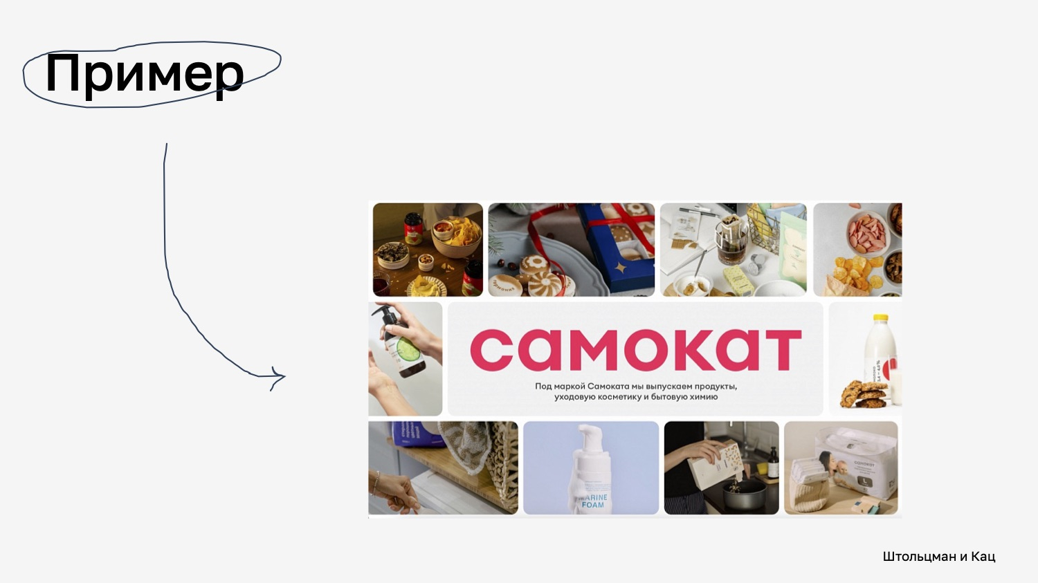 В этом случае оправдана работа с основным брендом компании, его распространение на СТМ. То есть он становится зонтичным брендом в одной или нескольких категориях товаров. Типичный пример — Самокат, предлагающий более 1000 товаров под своей маркой.