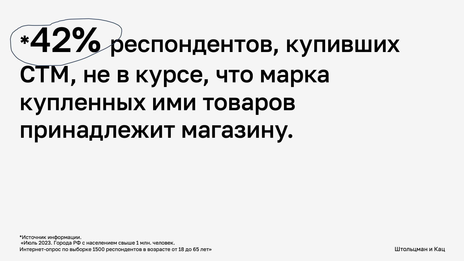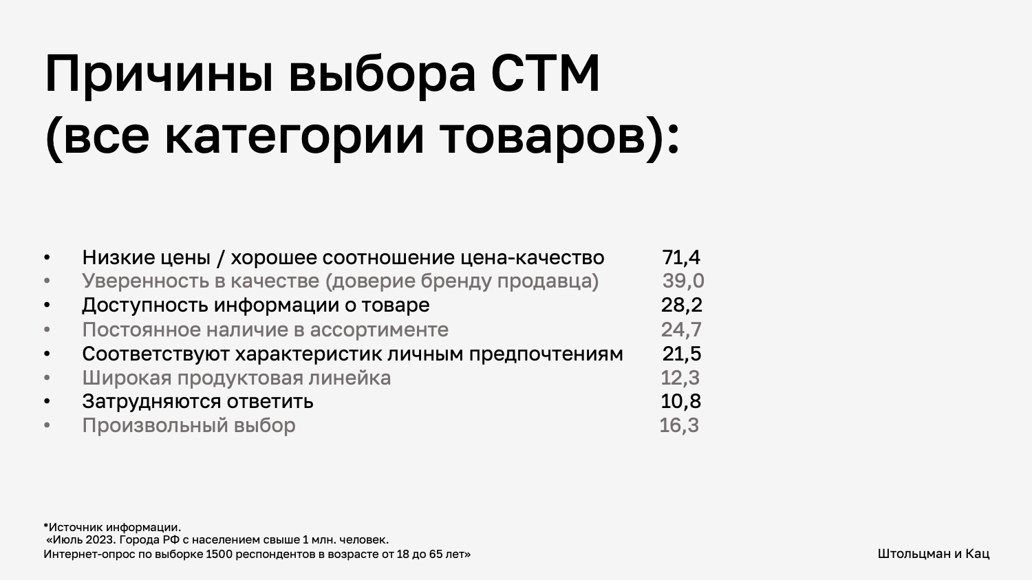 Как показано на слайде, «соответствие характеристик товара личным предпочтениям покупателя» не послужило причиной даже четверти покупок. То есть в подавляющем большинстве случаев покупка СТМ покупатели никак не связывают с какими-то особенностями самого продукта.