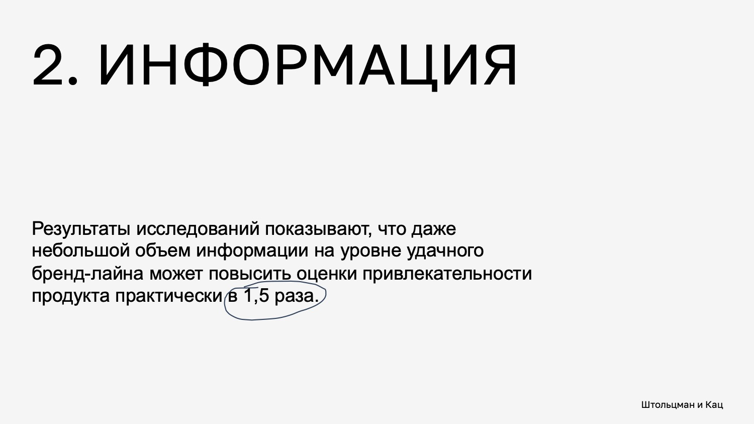А вот упаковка как раз наоборот — должна быть максимально информативна. Результаты исследований показывают, что даже небольшой объем информации на уровне удачного бренд-лайна может повысить оценки привлекательности продукта практически в 1,5 раза (зафиксированный нами рекорд: +57,4% позитивных оценок после вынесения на упаковку дополнительных информационных элементов по отношению к исходному варианту без них). Сегодня желательно уходить от минималистической, пусть даже стильной, но неинформативной упаковки. Потребитель хочет получить максимум информации стразу, не вдаваясь в описания товара. Поэтому так важно использовать тщательно проработанный бренд-лайн, выделять крупные элементы, несущих какую-то информацию о качестве продукта, технических характеристиках, обещанной эффективности, особых свойствах и другое. Вроде бы электронная коммерция предполагает, что покупателю по одному клику доступно подробное описание товара, характеристики, отзывы. Однако, информативная упаковка даже в этих условиях обеспечивает преимущества.