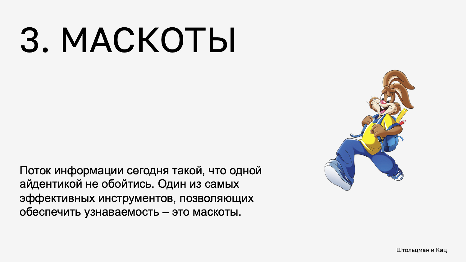 Активное использование маскотов. Поток информации сегодня такой, что обеспечить узнаваемость традиционными средствами — цвета, шрифты и так далее — уже не получается. Этого недостаточно, всегда окажется кто-то, у кого похожая графика, похожие цветовые решения, в целом айдентика, близкая к вашей. Один из самых эффективных инструментов, позволяющих обеспечить узнаваемость — это маскоты. Их пока сравнительно немного, они легко запоминаются, быстро становятся узнаваемыми покупателями. Кроме того, вокруг них можно строить какие-то мероприятия в сфере продвижения. Увы, использовать их редко кто решается — сказывается консерватизм, все хотят быть солидными и серьезными. А ведь это действительно рабочий инструмент современной айдентики.