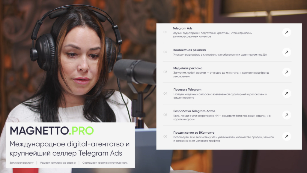 Этой весной я пришла в Magnetto.pro как директор по коммуникациям и развитию бренда. Потом моя должность трансформировалась в директора по маркетингу и коммуникациям. Агентство много чем занимается, его флагманская услуга — продвижение в Telegram Ads.