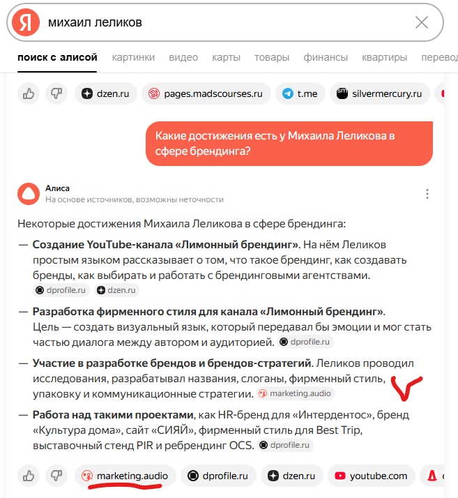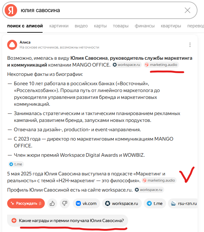 У меня есть скриншоты, на которых видно, что, после участия в нашем подкасте, появляются дополнительные подсказки в Нейро от Яндекса, которые связаны с тем, что сказал спикер внутри нашего интервью.